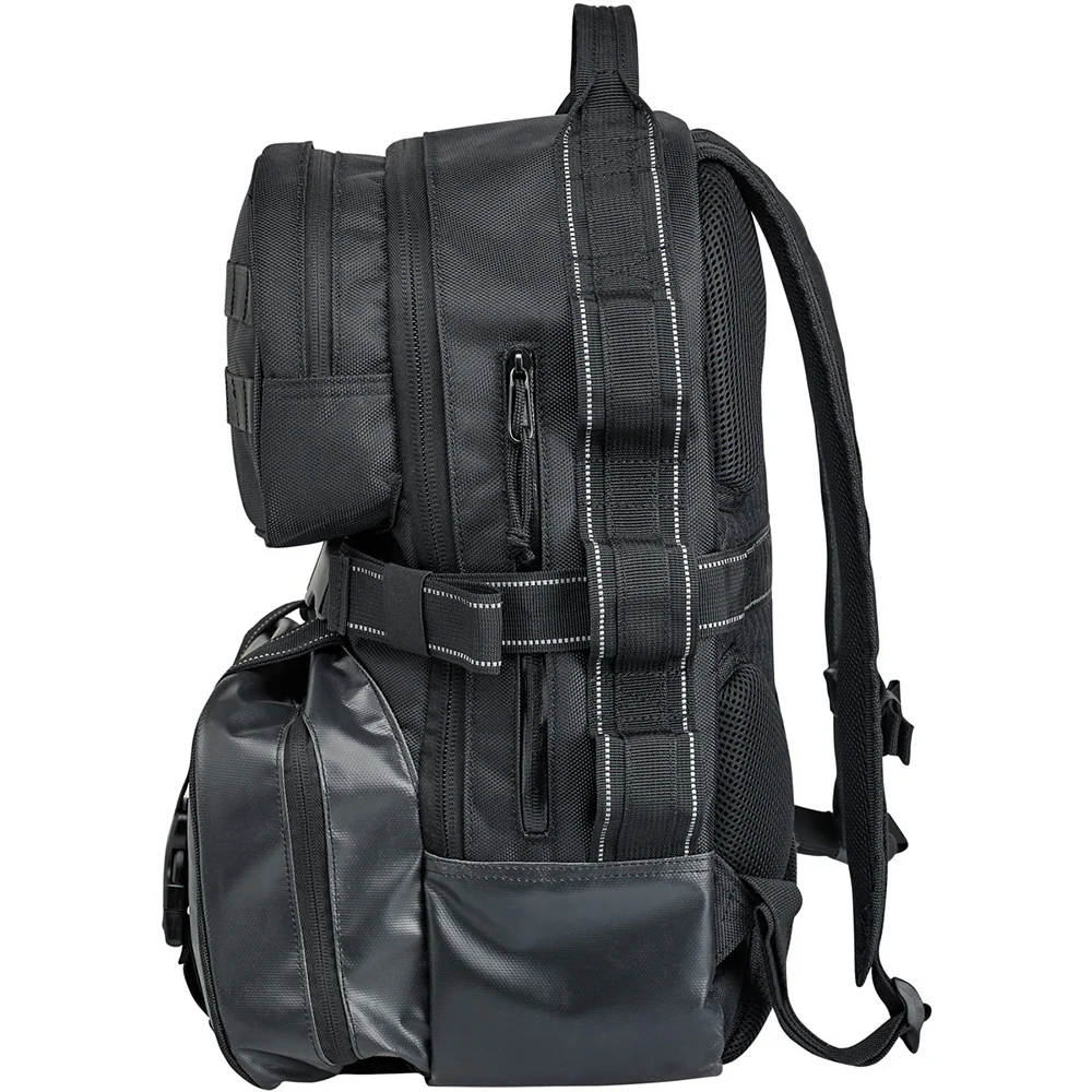 We invested many hours of R&D on this EXFIL unit; we wanted our first backpack to be the last one you ever need. One main and two secondary compartments hold 48 350ml / 12-ounce beverage cans—that's two cases of cold beer to get the party started if that's your mission. The lower secondary zipper compartment has a PVC-treated tool caddy and an internal zipper pouch to hold wrenches and small gear securely. The top secondary compartment houses an internal zipper pouch, and all three compartments have hi-vis orange nylon lining to make spotting contents easy. The padded shoulder straps feature an adjustable sternum strap to stabilize heavy loads. Cinch straps around EXFIL-48's perimeter do two things: compress loads for greater stability, and fasten the bag to your sissy bar when it's time to hit the highway.